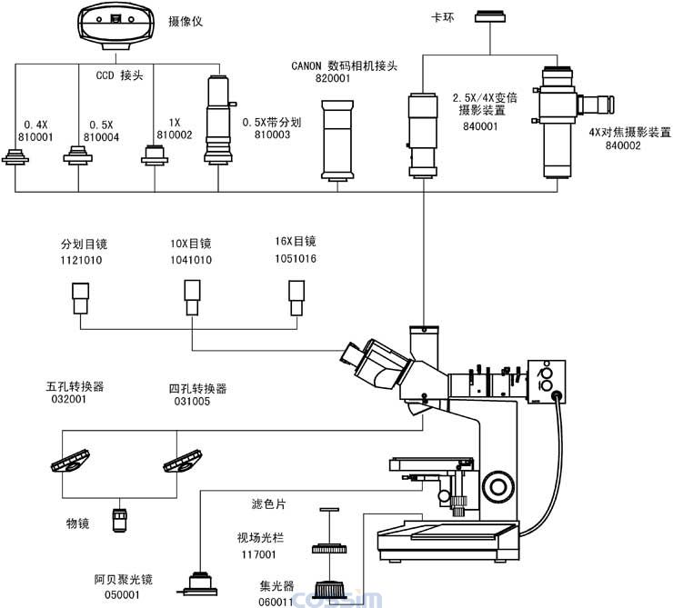 • 5、落射照明器:帶視場光欄、孔徑光欄、起偏振片,(黃,藍(lán),綠)濾色片和磨砂玻璃