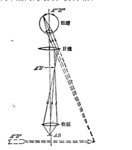 顯微鏡的基本放大原理如圖所示。其放大作用主要由焦距很短的物鏡和焦距較長(zhǎng)的目鏡來(lái)完成。為了減少象差,顯微鏡的目鏡和物鏡都是由透鏡組構(gòu)成復(fù)雜的光學(xué)系統(tǒng),其中物鏡的構(gòu)造尤為復(fù)雜。為了便于說(shuō)明,圖中的物鏡和目鏡都簡(jiǎn)化為單透鏡。物體AB位于物鏡的前焦點(diǎn)外但很靠近焦點(diǎn)的位置上,經(jīng)過(guò)物鏡形成一個(gè)倒立放大的實(shí)象AB′,這個(gè)象位于目鏡的物方焦距內(nèi)但很靠近焦點(diǎn)的位置上,作為目鏡的物體。目鏡將物鏡放大的實(shí)象再放大成虛象A"B",位于觀察者的明視距離(距人眼250mm)處,供眼睛觀察,在視網(wǎng)膜上成最終的實(shí)象A B