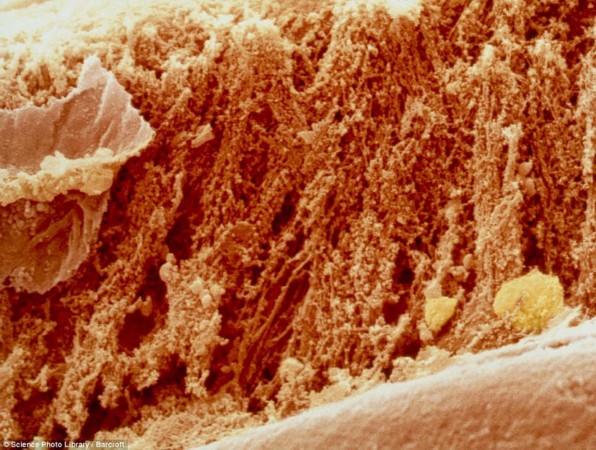 生肉在顯微鏡下的狀態(tài),可以看到脂肪纏繞在肌肉周圍。